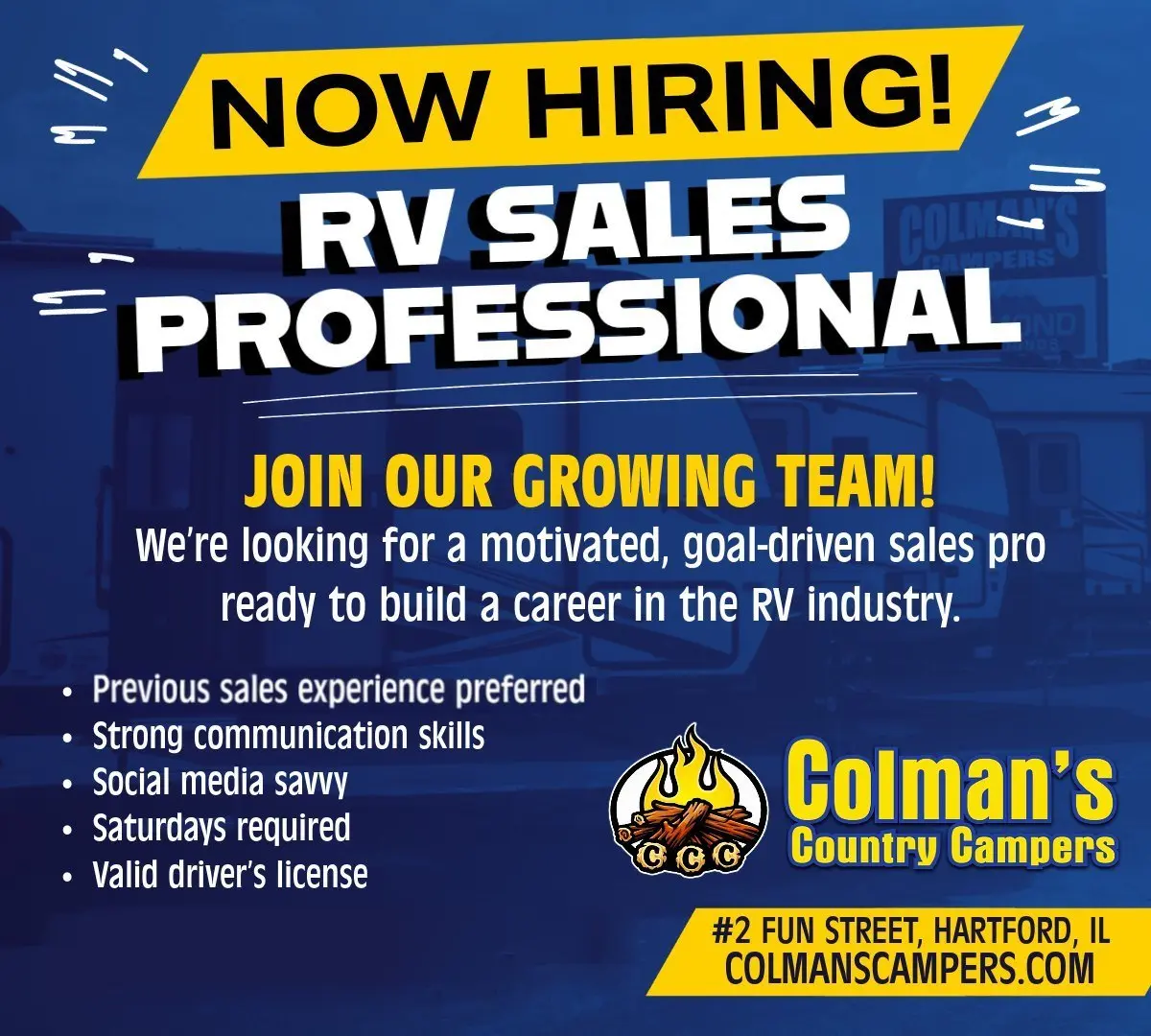 At Colman’s Country Campers in Hartford, Illinois, we’re passionate about helping people enjoy the great outdoors — and we’re always looking for dedicated, friendly professionals to join our team.